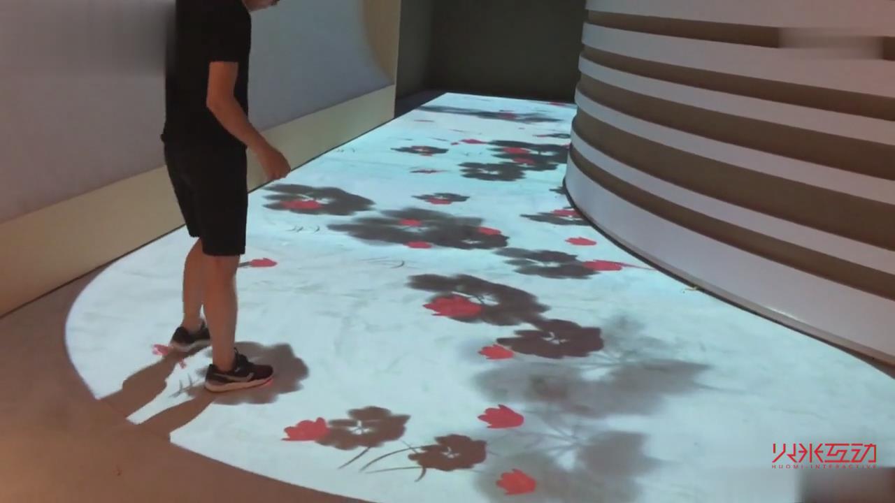 例如火米互動所做的地面魚水互動投影,當人走在地面上時,水面會出現波紋,水中的魚碰到人的腳時會被“嚇跑”。可以吸引客源,讓人在路過的時候直接被這樣一種地面互動投影所吸引。在商場和餐廳中目前使用這項地面互動的比較多,能夠快速的吸引人群的注意力。